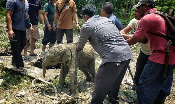“Setelah situasi mulai reda, terdengar suara anak gajah. Setelah dilakukan pencarian, ditemukan satu ekor anak gajah betina terperosok di septic tank sedalam sekitar 2–2,5 meter,” kata Supartono.