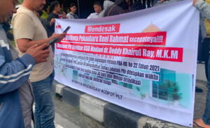 MP, PEKANBARU – Massa pendemo yang tergabung dalam Forum Pemuda Mahasiswa Peduli Hukum Riau (FPMPH-R) mendesak Pj Wako Roni Rakhmat memecat Pelaksana Harian (Plh) Dirut Rumah Sakit Daerah (RSD) Madani Pekanbaru, dr Deddy Khairul Ray.