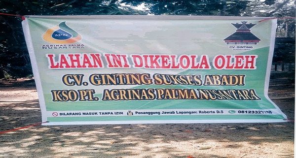 “Lahan ini dikelola oleh CV. Ginting Sukses Abadi KSO PT. Agrinas Palma Nusantara. Dilarang masuk. Penanggung jawab lapangan: Roberto D.S.”